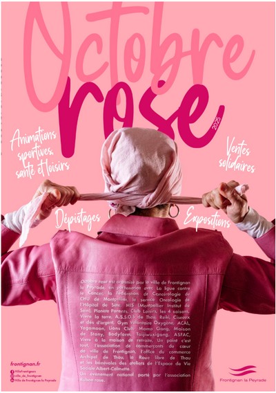 En octobre, alors que les projecteurs s’apprêtent à teinter de rose l’Hôtel de Ville, Frontignan la Peyrade se mobilise pour la 32e campagne mondiale de lutte contre le cancer du sein. Un grand nombre de rendez-vous se prépare en partenariat avec les associations locales, les instituts de recherche et les organismes de prévention et de suivi du cancer du sein. Au programme : information, convivialité, sport, expositions, dépistages et opérations caritatives.