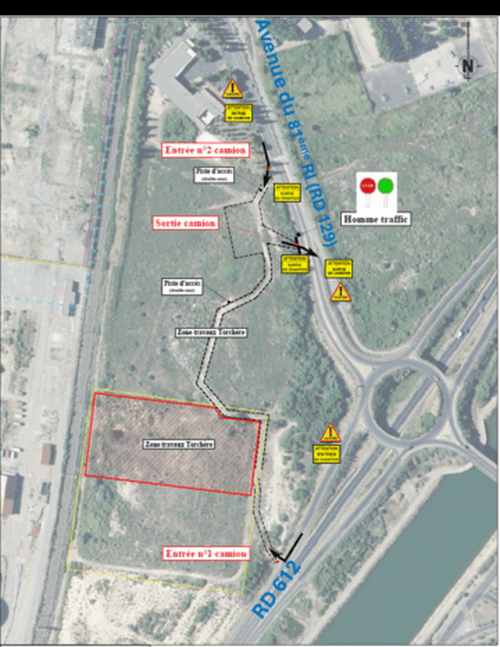 Les camions entreront du site à la fois au niveau de l’avenue du 81ème Régiment d’Infanterie (RD129) et par la bretelle d’accès à la route départementale RD 612. Ils sortiront au niveau d’un nouvel accès sur l’avenue du 81ème RI. Un plan de circulation a été défini avec les services de la Ville et du département de l’Hérault. Une signalisation sera mise en place pour avertir les usagers.