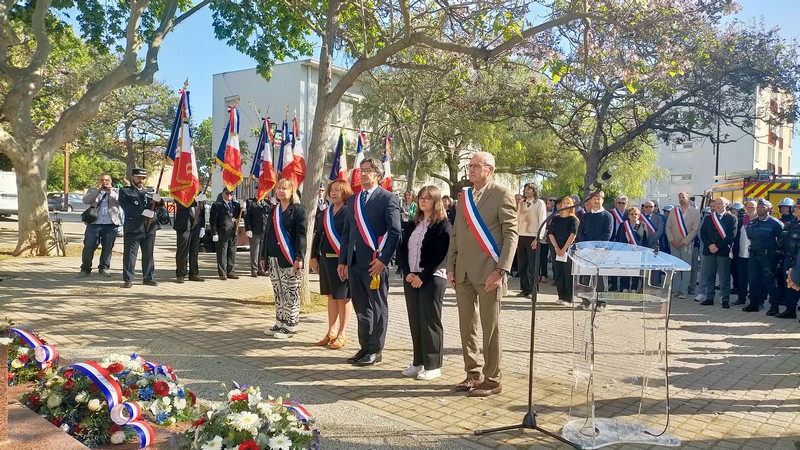 Pour cette cérémonie, marquant les 80 ans de la capitulation allemande, les porte-drapeaux, les autorités civiles et militaires, le Conseil municipal au complet, le sénateur Bourgi, le député Carrière et six jeunes du Corps Européen de Solidarité (CES) actuellement à Frontignan, se sont rassemblés autour du Maire, Michel Arrouy, pour commémorer cet épisode de notre histoire.