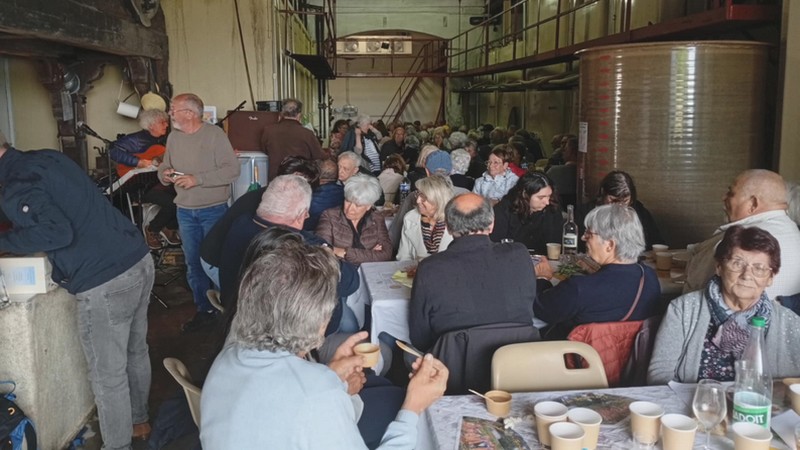 Une balade écourtée par une pluie battante qui a contraint tous les participants à se mettre à l’abri au château de la Peyrade de M. Pierre Gisbert, propriétaire des lieux qui a proposé une dégustation de ses crus au 138 personnes entassées dans le Chaix, suivie par le repas des Chevaliers de la Muscarole composé d’une brasucade de moules, macaronade, fromage et dessert, accompagné comme il se doit par de grands crus. Le tout en musique par le duo AZUR avec au programme des chansons locales aux airs de muscat.