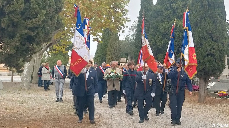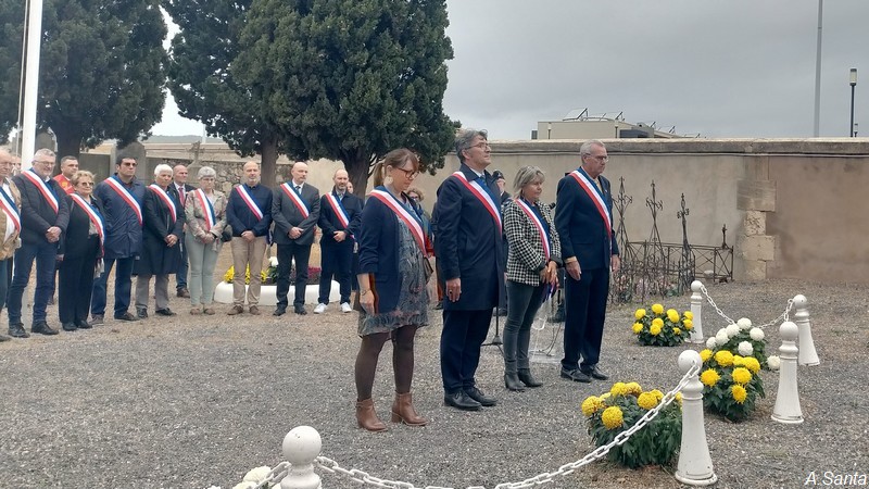 Rassemblés autour du carré du souvenir, au cimetière, avenue des Thermes, associations d’anciens combattants, portes drapeaux, le souvenir Français local en présence de sa Présidente Mme Véronique Gautier Robergeon, les jeunes sapeurs-pompiers du SDIS 34, le maire Michel Arrouy, accompagné par une pléiade d’élus et quelques anonymes ont rendu hommage aux disparus, morts pour la France.