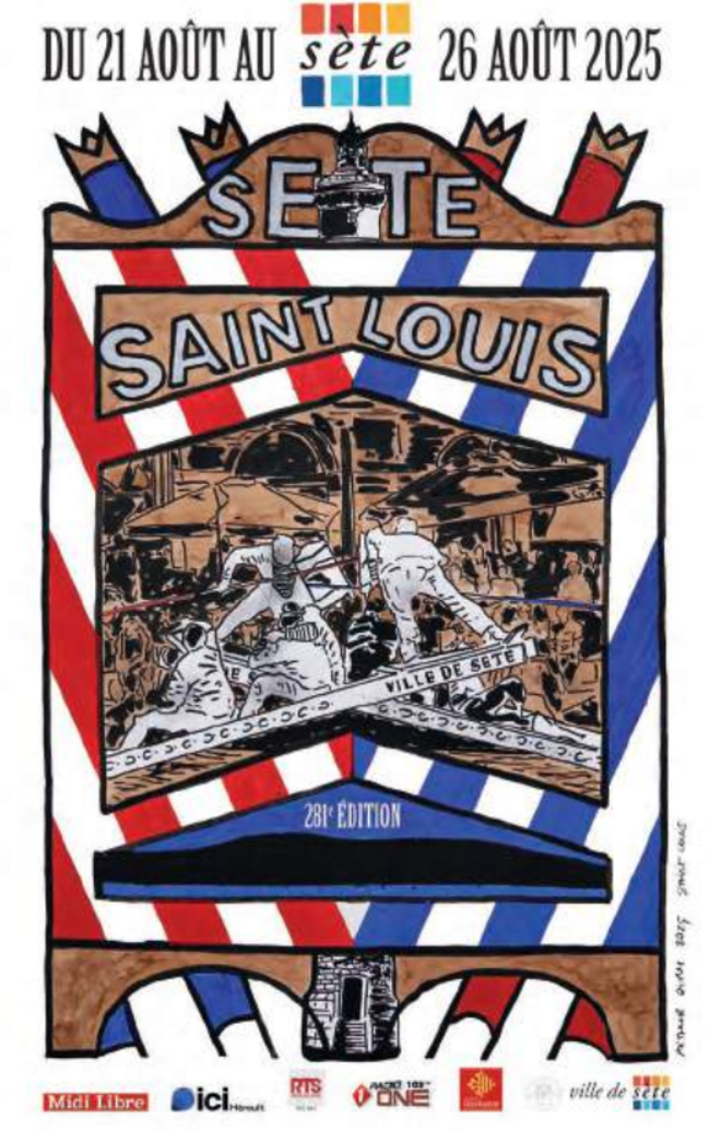 L’artiste sétois Arthur Dupuy signe l’affiche 2025 : un pavois central comme un cœur vibrant, entouré des symboles de la ville – le phare, le mont Saint-Clair, les couleurs des joutes. Un geste artistique qui s’inscrit dans la continuité familiale et rappelle que la Saint-Louis est avant tout une histoire de transmission.