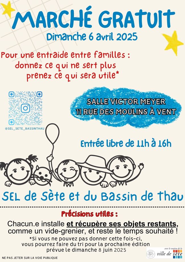 Donnez ce qui ne vous sert plus et prenez ce qui vous sera utile ! Le marchégratuit, organisé par le Système d'Échange Local (SEL) de Sète et du Bassin de Thau, est de retour pour sa 7e édition. Il se tiendra dimanche 6 avril 2025 de 11h à 16h dans la salle Victor Meyer à la maison de la vie associative de Sète.