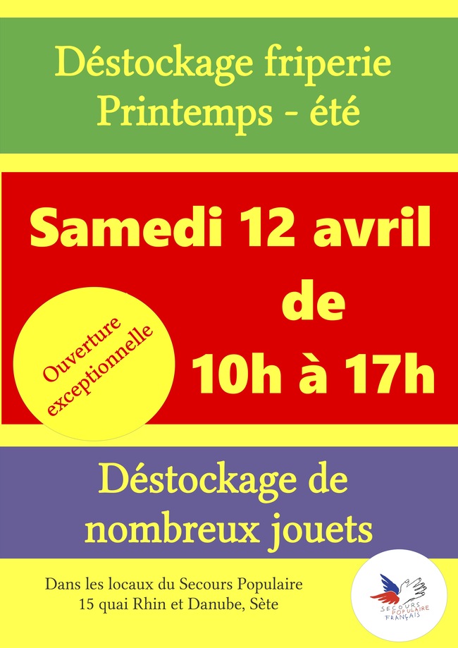 Le Secours populaire de Sète (SPF) organise un grand déstockage friperie printemps - été le samedi 12 avril de 10h à 17h dans ses locaux 15, quai Rhin-et-Danube à Sète.