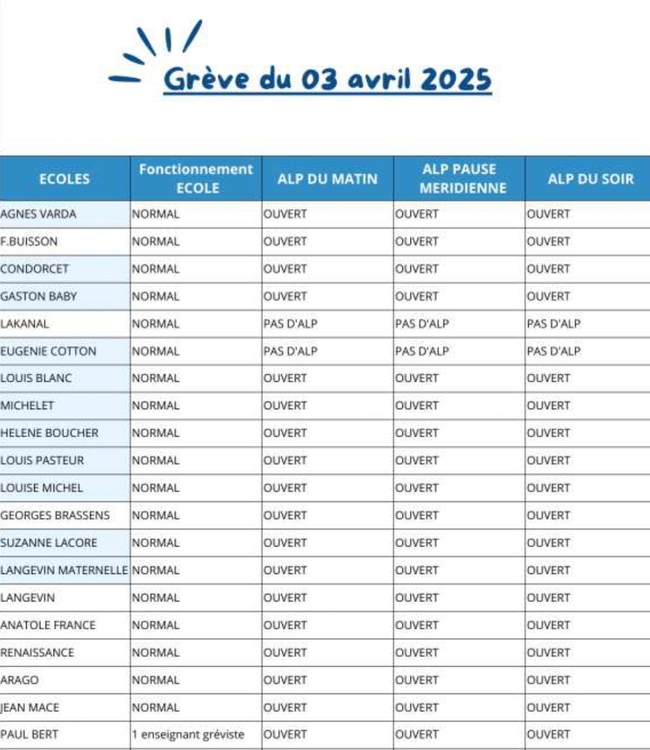 Suite à l'appel national à la grève lancé par plusieurs syndicats jeudi 3 avril 2025, la ville de Sète informe que des perturbations sont à prévoir dans certaines écoles et accueils de loisirs périscolaires (ALP).