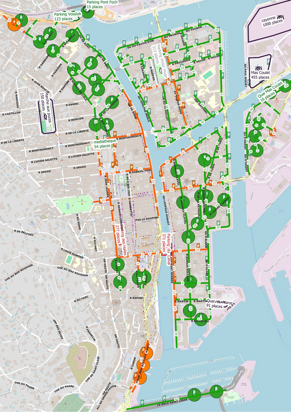 Après la fermeture de l’entrée du parking du Canal sur le quai de la Marine pour permettre l’aménagement du quai et finaliser la circulation des transports doux, c’est-à-dire créer et sécuriser la voie piétonne et cyclable, il a été constaté un transfert d’une partie des fréquentations du parking du canal vers le parking des halles. Les travaux de modernisation et d’embellissement des parkings des halles et du canal ont permis de fluidifier la circulation à leurs abords et diminuer le temps d’attente en période de très grosse fréquentation. La Ville a également créé le parking Vossloh à proximité du pont Sadi-Carnot pour compenser la suppression des stationnements le long du quai de Bosc réaménagé pour une circulation douce. En quelques chiffres, depuis le lancement en 2015, 6480m² de rénovations voiries et d’aménagements des quais pour 7.1M€. 8383m² de voies piétonnes ont déjà été créées en cœur de ville (objectif de 11 000m² à terme).