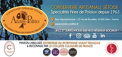 AZAÏS-POLITO vous garantit des produits de la Mer « authentiques » et vous invite à la découverte des spécialités « sétoises » comme la Soupe de Poisson de roche à la sétoise, la Rouille sétoise et les Célèbres Moules et Encornets farcis à la Sétoise, qu’elle fût la première à mettre en conserve et à commercialiser dans les années 60.